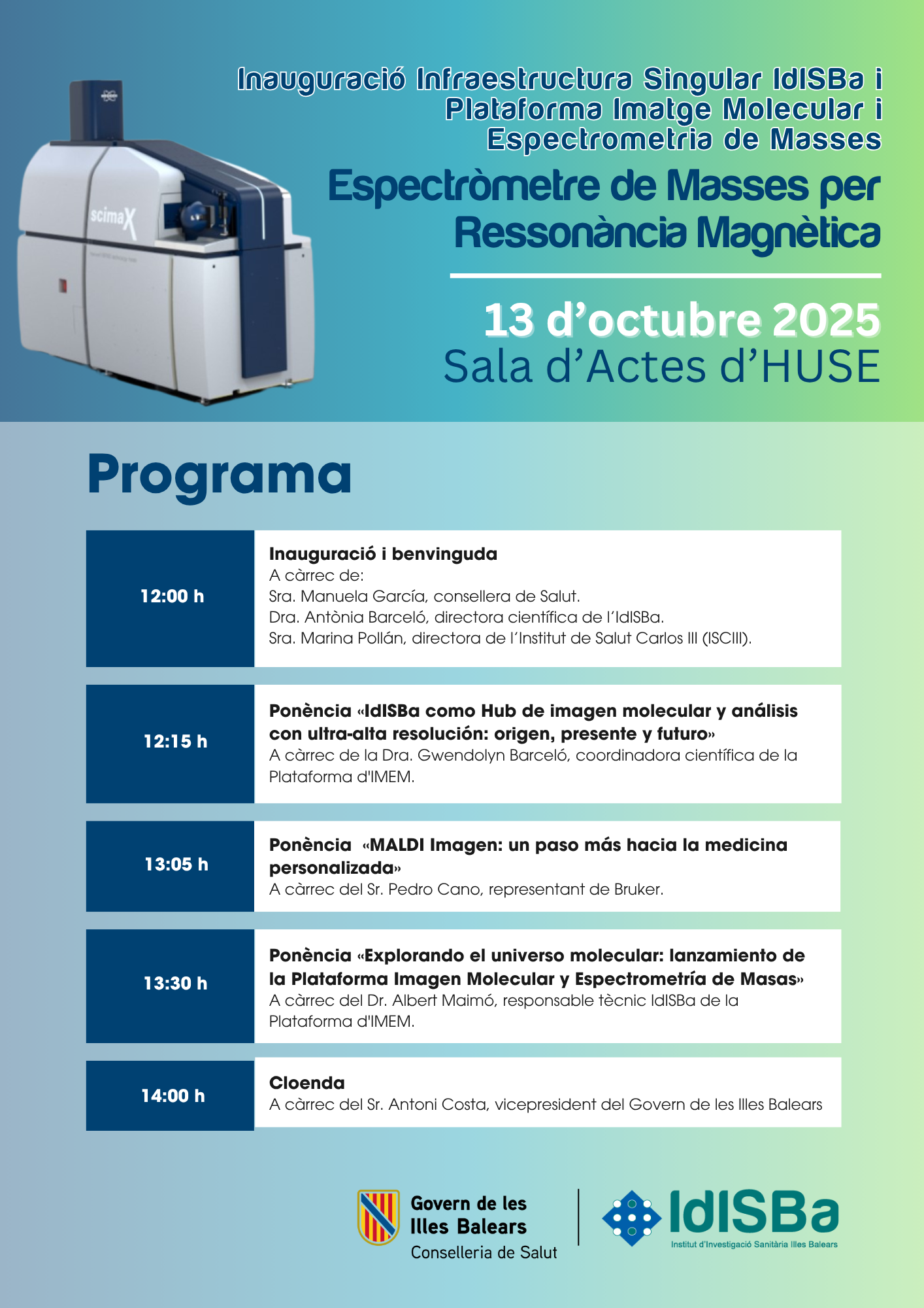 ’Institut d’Investigació Sanitària Illes Balears (IdISBa), en col·laboració amb la Conselleria de Salut, té el plaer de convidar-vos a l’acte d’inauguració de la nova Infraestructura Científica Singular d’Imatge Molecular i Espectrometria de Masses, una fita que reforça el compromís de les Illes Balears amb la recerca biomèdica d’avantguarda.