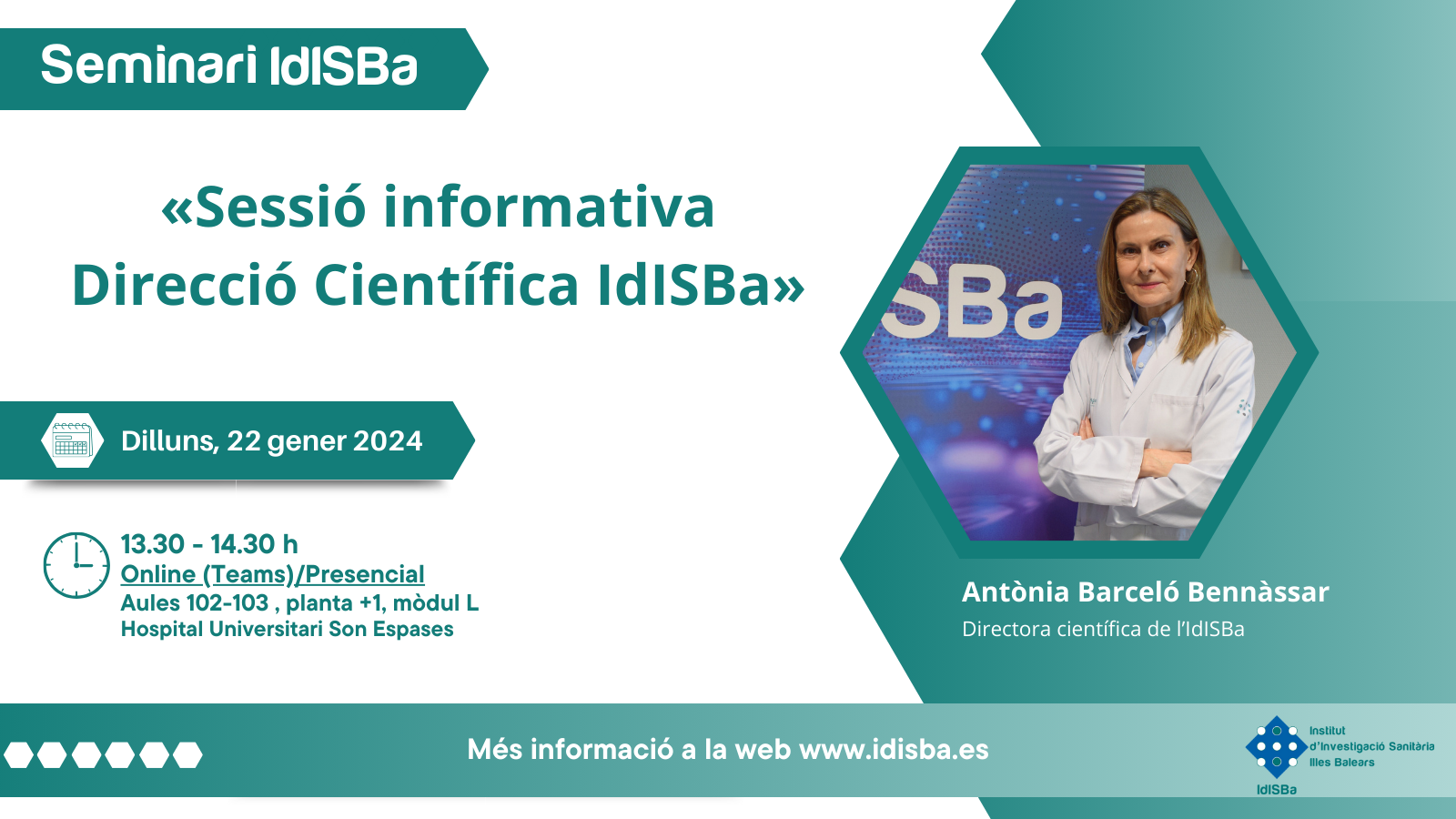 El lunes 22 de enero, a las 13.30 horas, las aulas 102-103 del Hospital Universitario Son Espases, acogerán el seminario IdISBa «Sesión informativa Dirección Científica IdISBa», a cargo de la Dra. Antònia Barceló Bennàssar, directora científica del IdISBa.