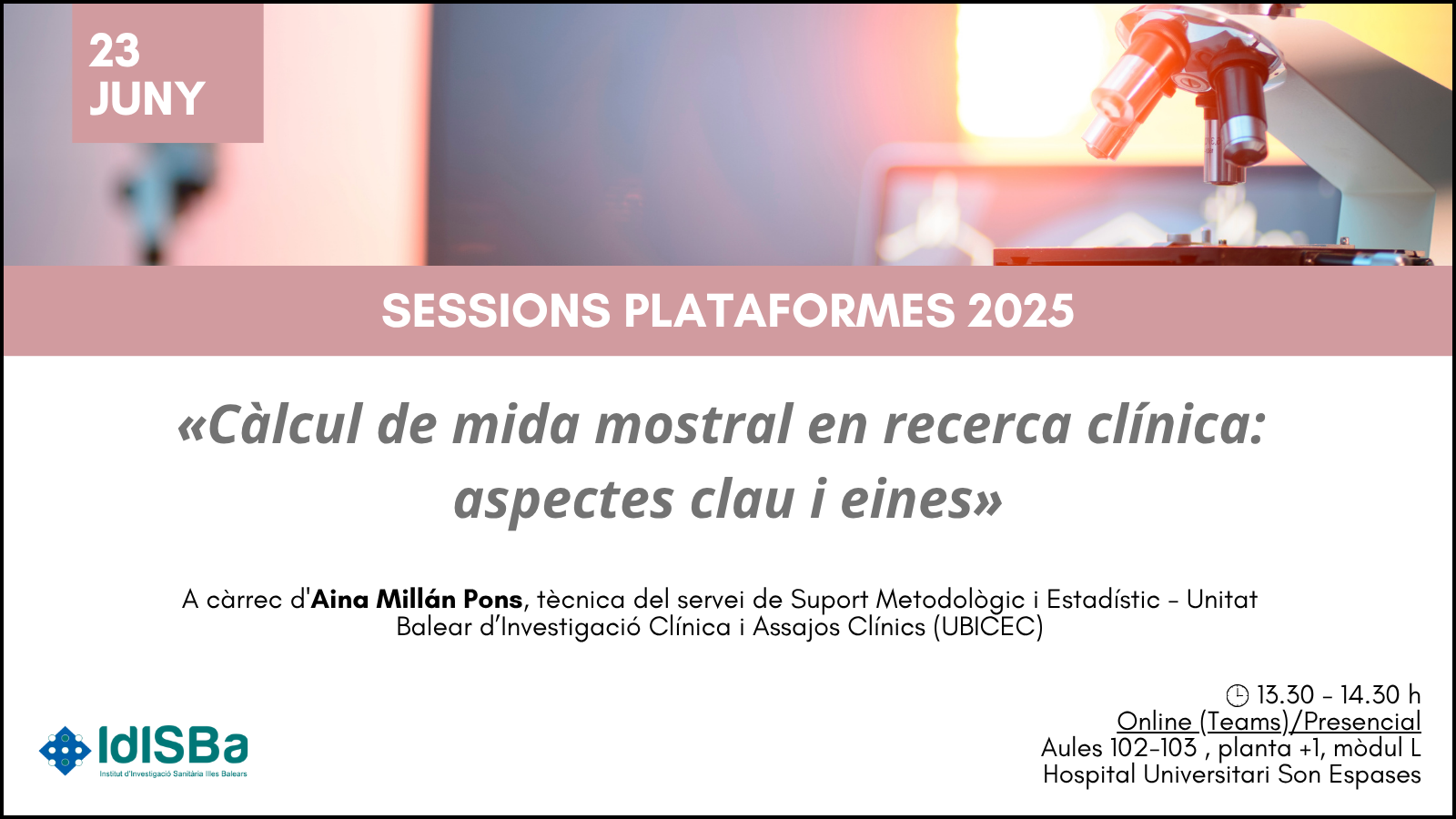 El lunes 23 de junio a las 13:30 horas, las aulas 102-103 del Hospital Universitario Son Espases acogerán el seminario IdISBa «Càlcul de mida mostral en recerca clínica: aspectes clau i eines», a cargo de la Sra. Aina Millán Pons, técnica del servicio de Apoyo Metodológico y Estadístico – Unidad Balear de Investigación Clínica y Ensayos Clínicos (UBICEC).