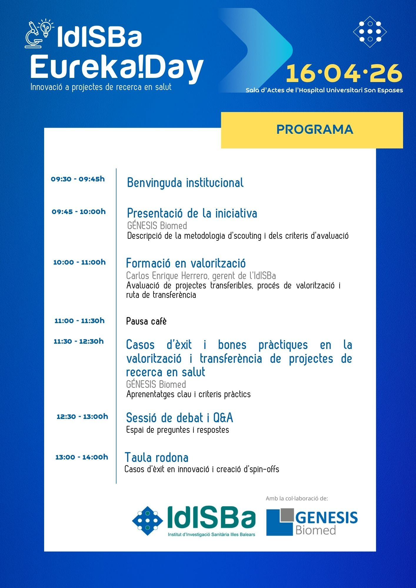 The Health Research Institute of the Balearic Islands (IdISBa) will hold the Eureka!Day on April 16, an event designed to identify, analyse, and prioritise innovative opportunities in health research projects, with the aim of boosting their transfer to the healthcare system and the productive sector.