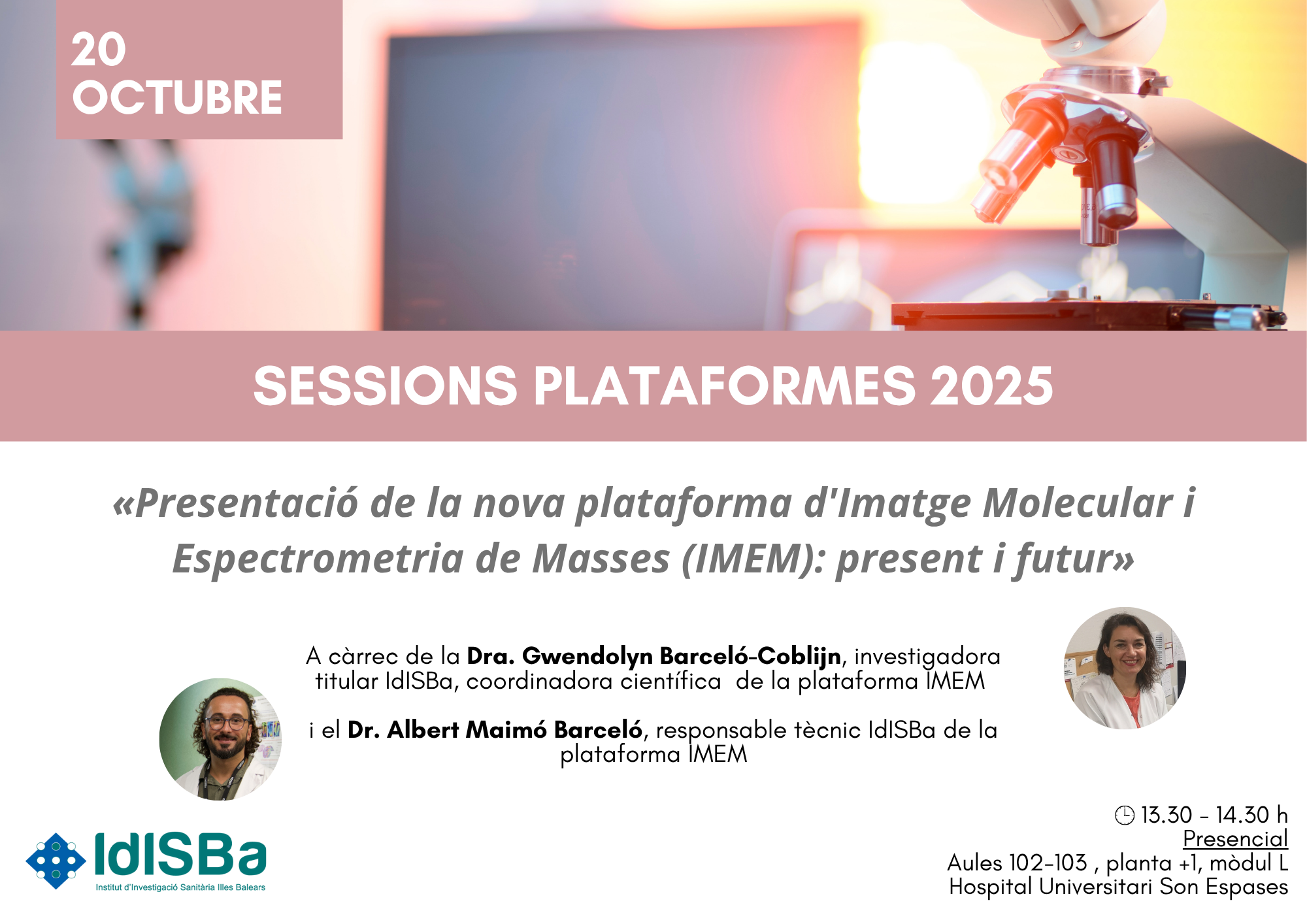 El lunes 20 de octubre a las 13:30 horas, las aulas 102-103 del Hospital Universitario Son Espases acogerán el seminario Plataformas IdISBa «Presentació de la Nova Plataforma d'Imatge Molecular i Espectroscopia de Masses (IMEM): present i futur», a cargo de la Dra. Gwendolyn Barceló-Coblijn, investigadora titular de IdISBa, coordinadora científica de la Plataforma IMEM, y del Dr. Albert Maimó Barceló, responsable técnico de IdISBa de la Plataforma IMEM.