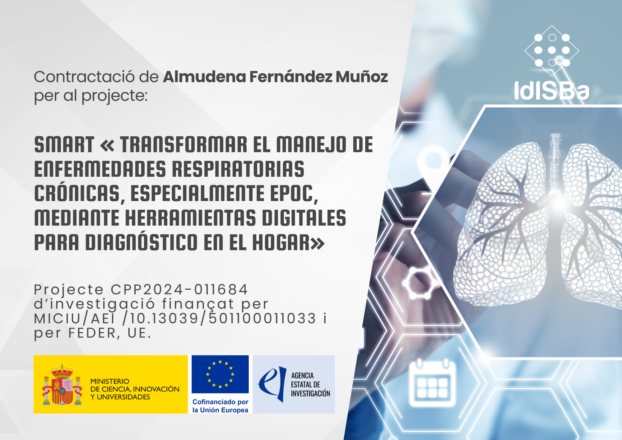 El IdISBa renueva el contrato de Almudena Fernández Muñoz, quien continuará desarrollando su labor como investigadora del grupo profesional A en el marco del proyecto SMART – “Transformar el manejo de enfermedades respiratorias crónicas, especialmente EPOC, mediante herramientas digitales para diagnóstico en el hogar”.